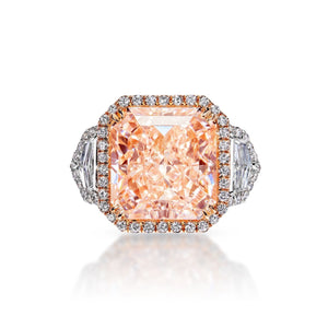 PRIEM 15 Carat Radiant Cut Fancy Intense Orangy Pink Three Stone Diamond Engagement Ring GIA Certified 13 CT Fancy Orangey Pink by Mike Nekta NYC
