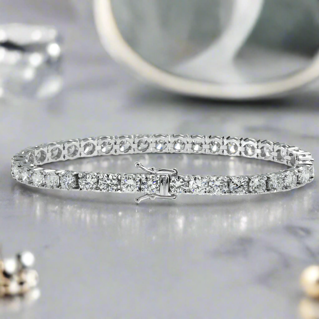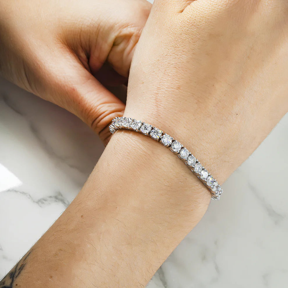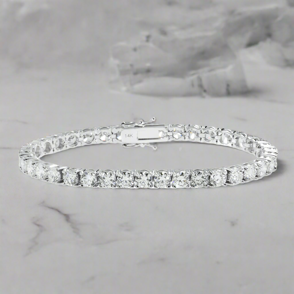 The Lehak 12 Carat Round Lab-Grown Diamond Tennis Bracelet in 14K White Gold is a stunning piece of fine jewelry, featuring meticulously set lab-grown diamonds. The bracelet offers a modern take on classic elegance, with 12 carats of sparkling diamonds showcased in a sleek 14K white gold setting. Its versatile design makes it an ideal choice for both casual and formal occasions.