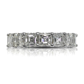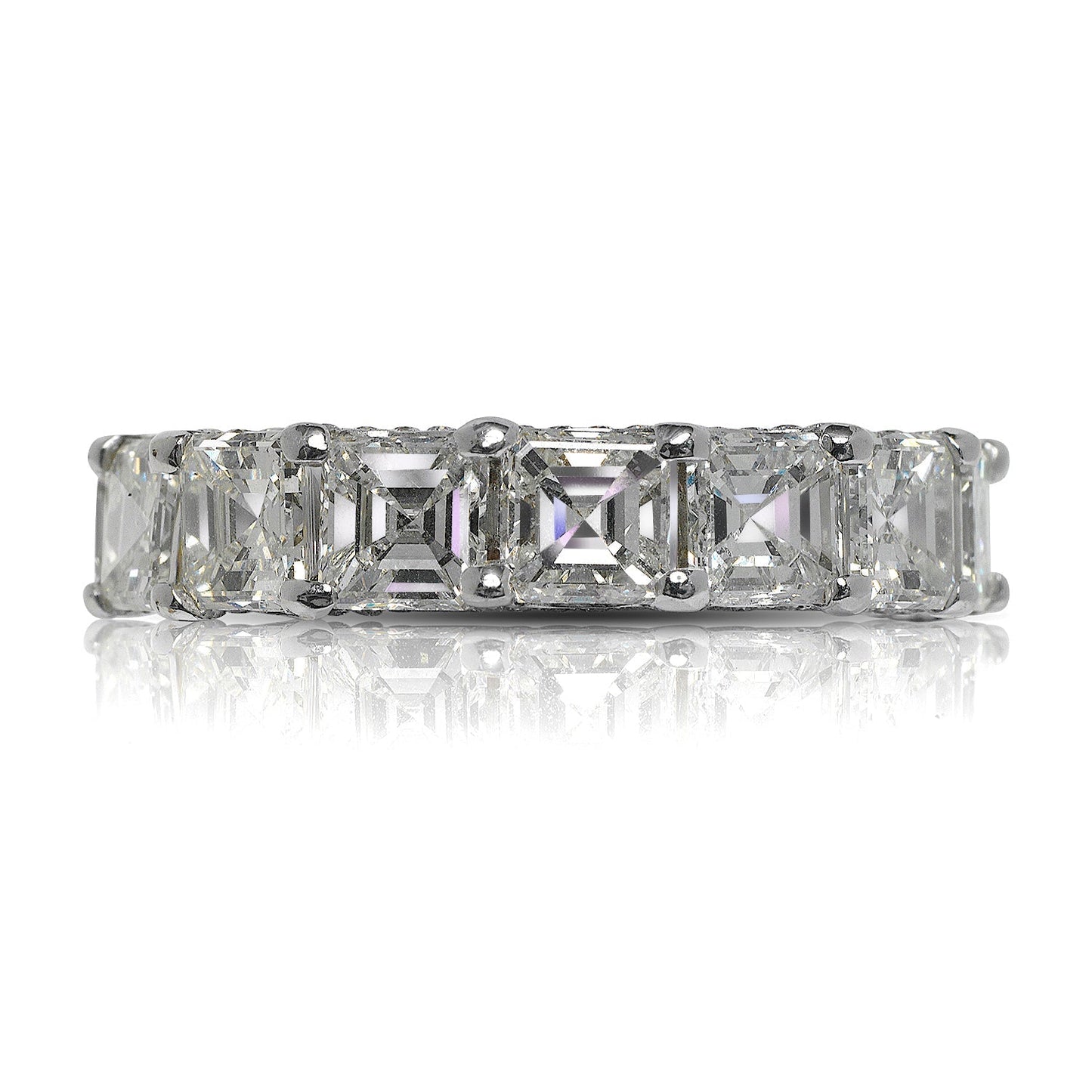 The SER wedding eternity band features 15 Asscher cut 55 pointer diamonds weighing a total of approximately 8.5 carats, micro pave shared prong set in 18K white gold.