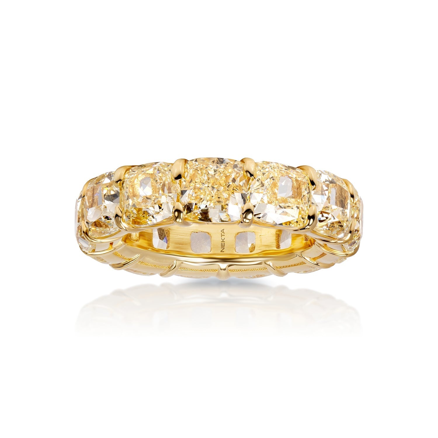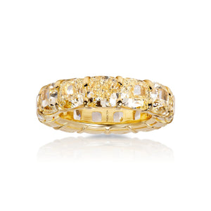 The TZE wedding eternity band features thirteen 1 carat cushion cut yellow diamonds weighing a total of approximately 14 carats, Shared prong set in 18k yellow Gold.