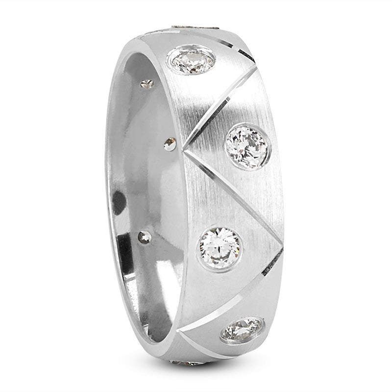 The Weston Diamond Wedding Band for Men features Concave Set 10 Round Cut brilliant 10 pointer diamonds weighing a total of approximately 1.0 carats, set in the metal of your choice.