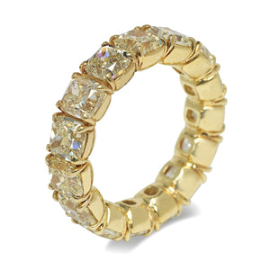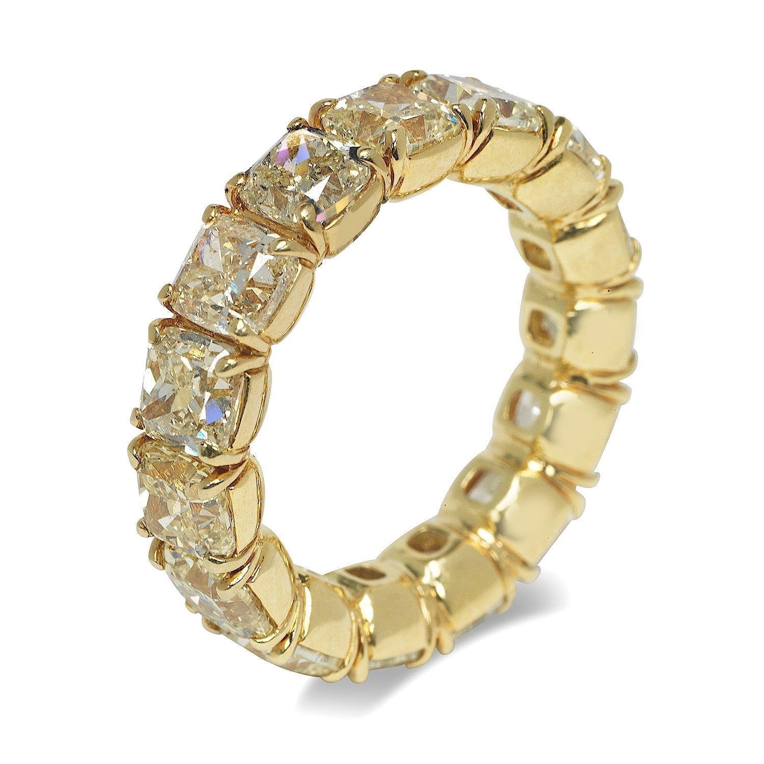 The YANG wedding eternity band features 15 cushion cut 60 pointer yellow diamonds weighing a total of approximately 9.5 carats, Shared prong set in 18k yellow Gold.
