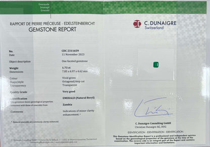 1.73 CARAT EMERALD CUT NATURAL GREEN EMERALD LOOSE GEMSTONE. 1.73 CT GREEN ZAMBIA BY MIKE NEKTA NYC