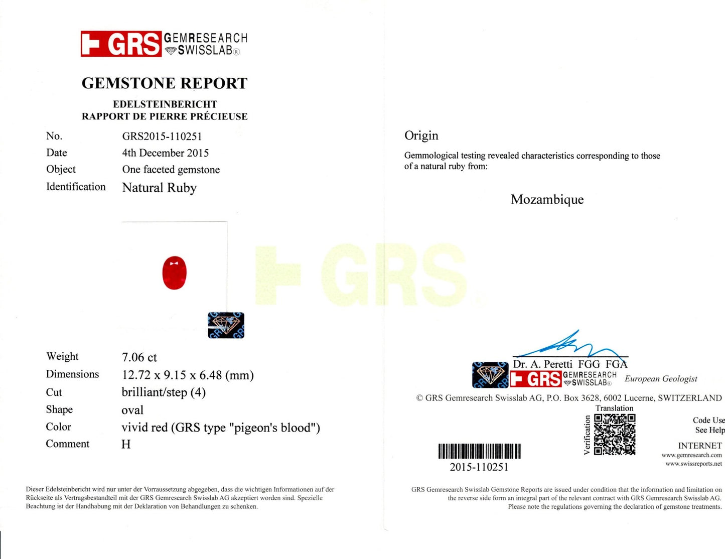 Color Grade : Vivid Red (GRS Type "Pigeon's Blood")