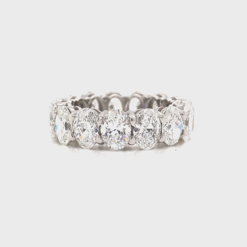 The AZALEA Wedding Anniversary Eternity Band features 13 Oval Cut 50 pointer diamonds weighing a total of approximately 6.70 carats, Shared Prong set in Platinum.