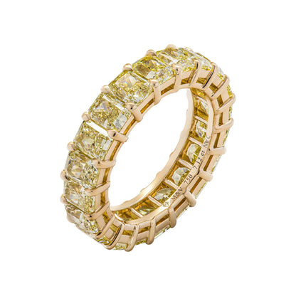 The CELIA Wedding Anniversary eternity band features 20 Radiant Cut 35 pointer diamonds weighing a total of approximately 7.12 carats, Shared Prong set in 18K Yellow Gold.
