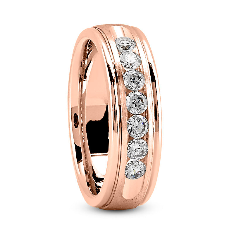 The Christopher Diamond Wedding Band for Men features Channel Set 7 Round Cut brilliant 14 pointer diamonds weighing a total of approximately 0.98 carats, set in the metal of your choice.