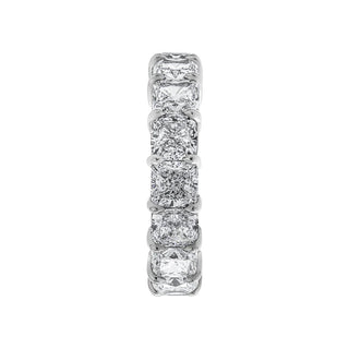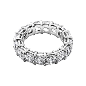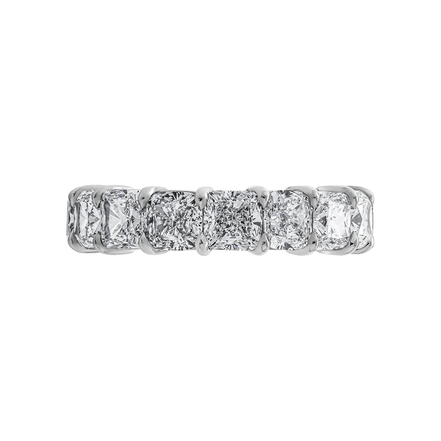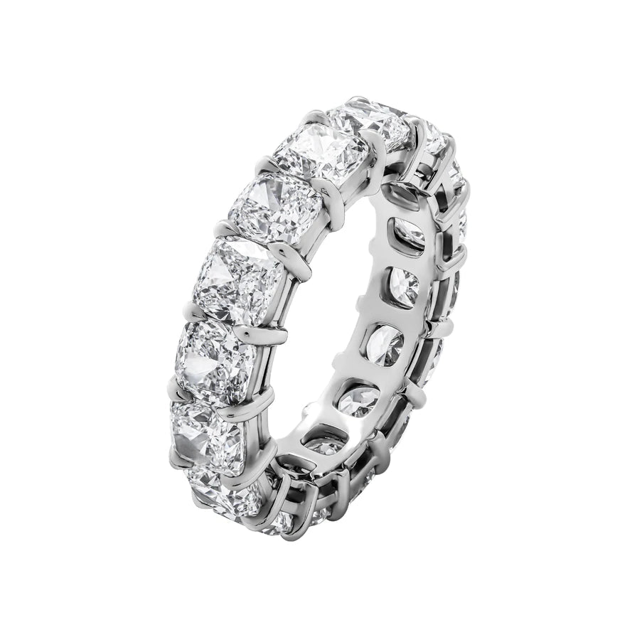 The NICA Wedding Anniversary Eternity Band features 16 Cushion Cut 50 pointer diamonds weighing a total of approximately 8.59 carats, Shared Prong set in Platinum.