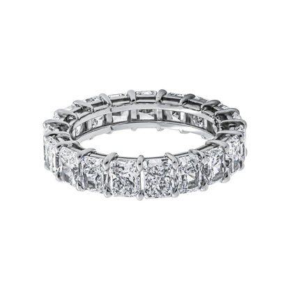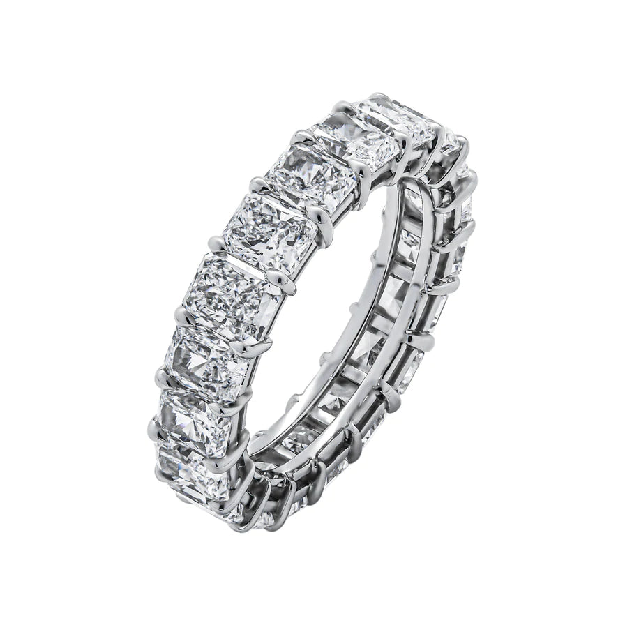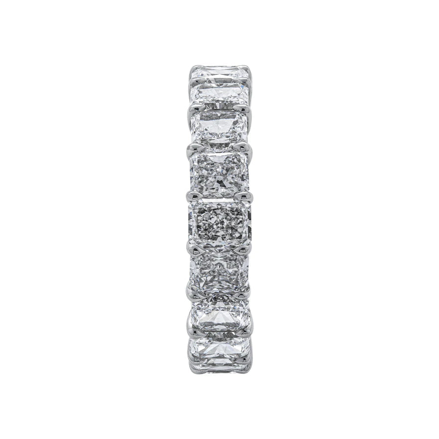 The CRYSTAL Wedding Anniversary Eternity Band features 19 Radiant Cut 30 pointer diamonds weighing a total of approximately 5.81 carats, Shared Prong set in Platinum.