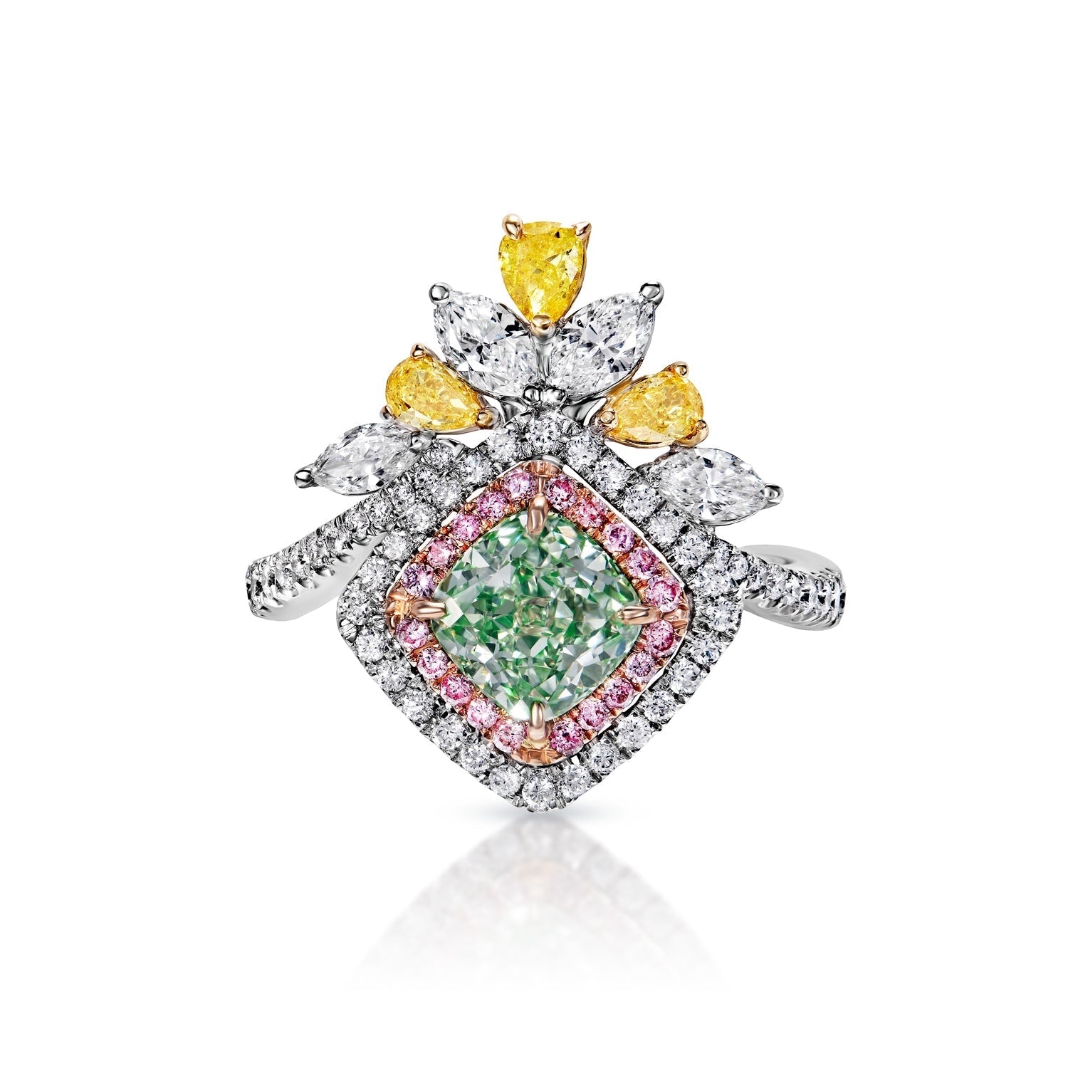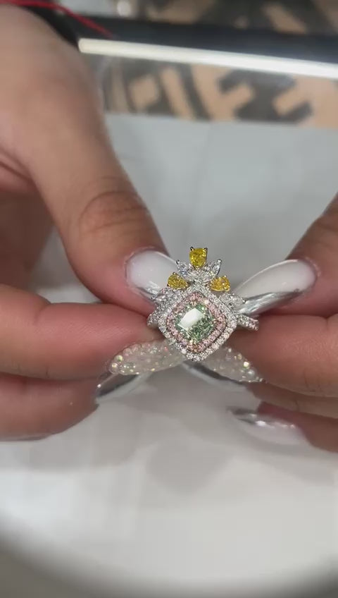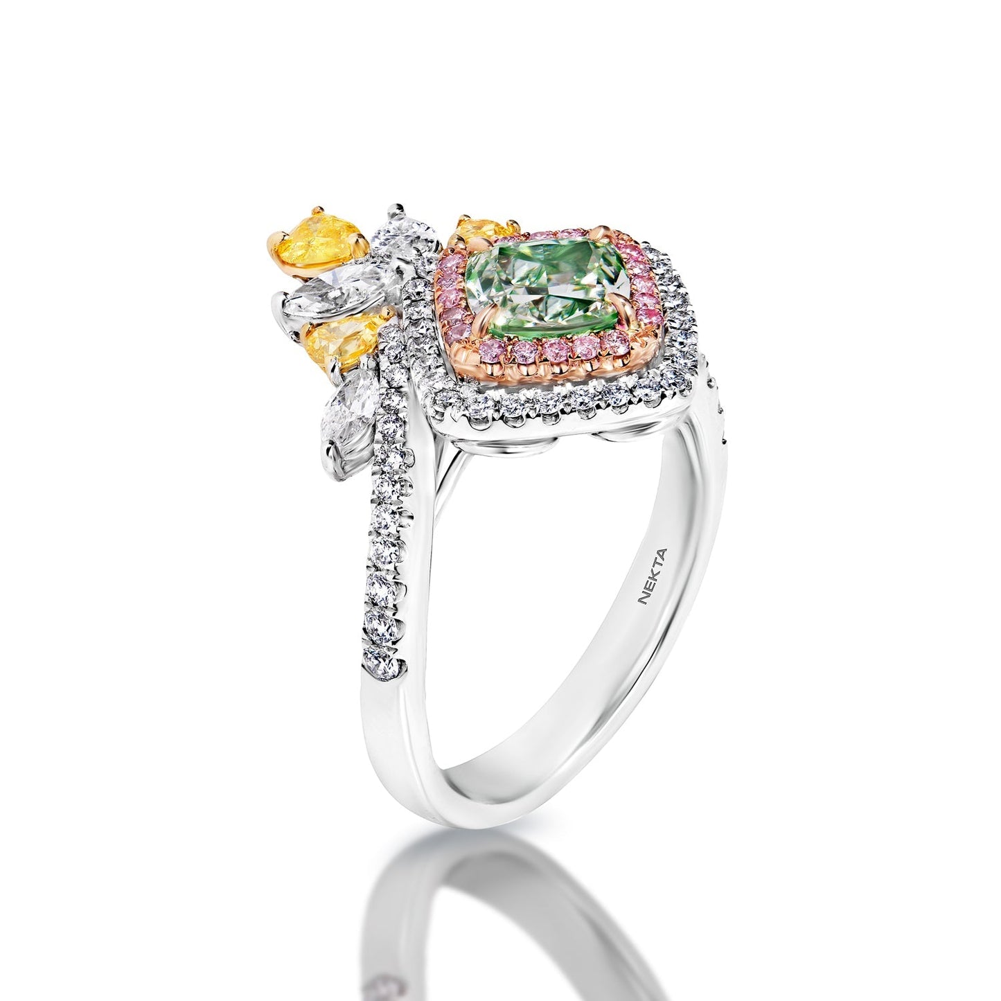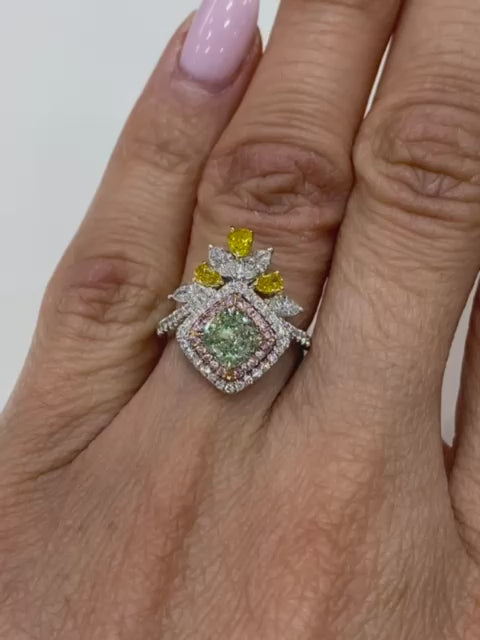 Emmie 3 Carat Fancy Light Yellowish Green SI1 Cushion Cut Diamond Engagement Ring in White Gold By Mike Nekta.