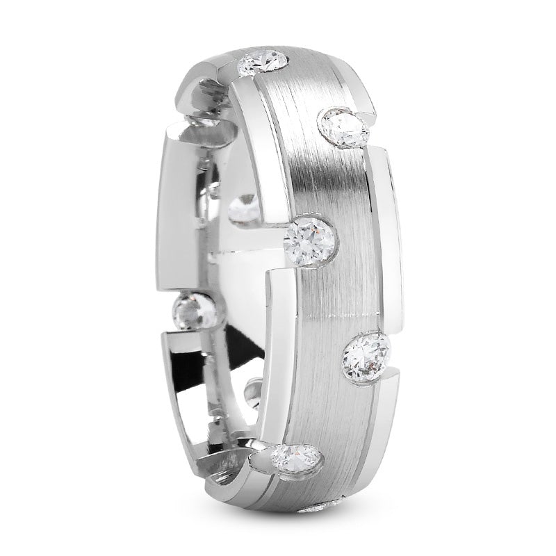 The FRANKLIN Diamond Eternity Wedding Band for Men features 12 round brilliants 7 pointer natural diamonds weighing a total of approximately 0.90 carats set in the metal of your choice. 7mm band, Comfort Fit.