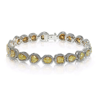 HENIN 20 Carat Fancy Yellow Heart Pear and Cushion Cut Inline Halo Diamond Tennis Bracelet in 18K White Gold By Mike Nekta NYC