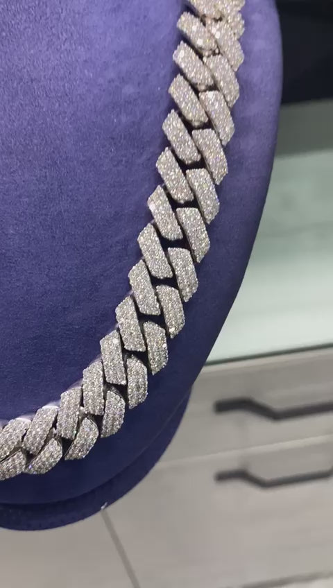 Diamond ICED OUT CUBAN CHAIN For Male, a luxurious and one-of-a-kind piece of jewelry. This stunning diamond is mined from the center of the earth, making it extremely rare and valuable. It weighs an impressive 58.71 Carats and is set in a beautiful 14-karat white gold necklace. The necklace itself weighs 409.60 grams and is absolutely stunning. It's the perfect statement piece for any man who wants to show off his unique style and taste.