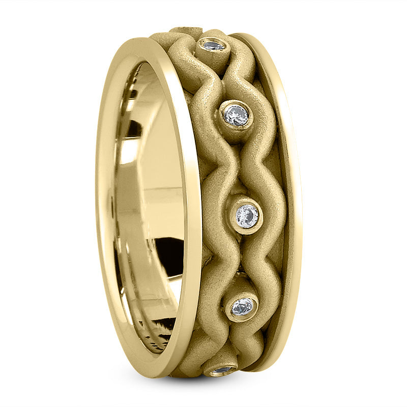 The Jaxon Diamond Wedding Band for Men features Wavy Rope 11 Round Cut brilliant 2 pointer diamonds weighing a total of approximately 0.22 carats, set in the metal of your choice.