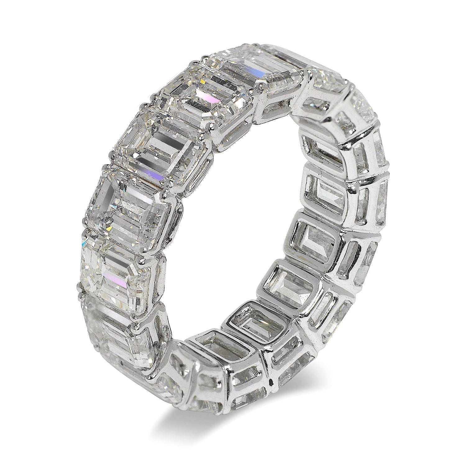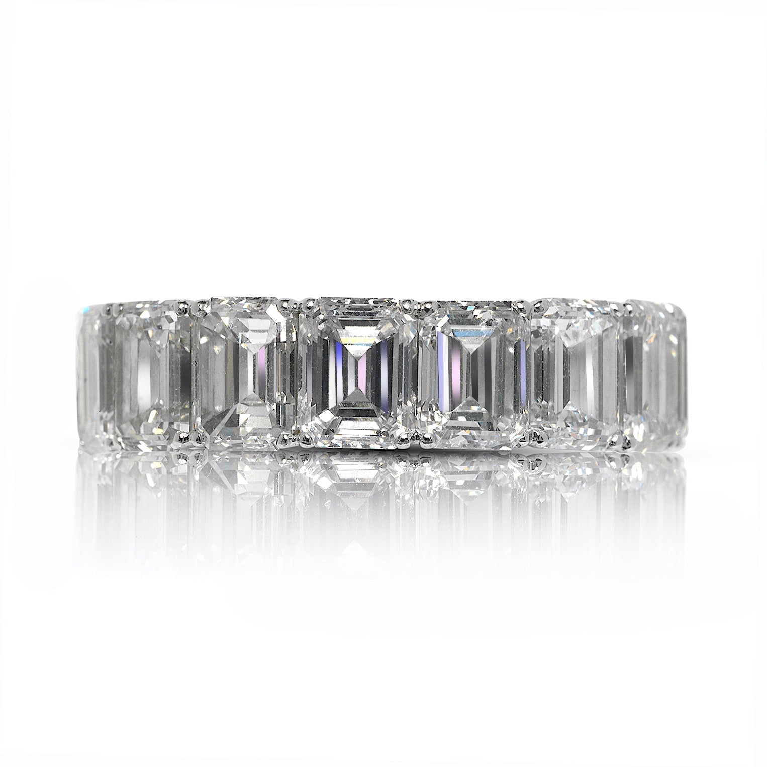 The KAWA wedding eternity band features 16 Emerald Cut 70 pointer diamonds weighing a total of approximately 11.6 carats, Shared Prong set in 18K White Gold.