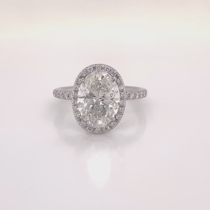A: The ring features a stunning 3.08 carat G color VS1 clarity oval cut lab-grown diamond center stone. The ring also boasts 0.48 carats of beautiful side diamonds in an 18k white gold setting. The ring is GIA certified.