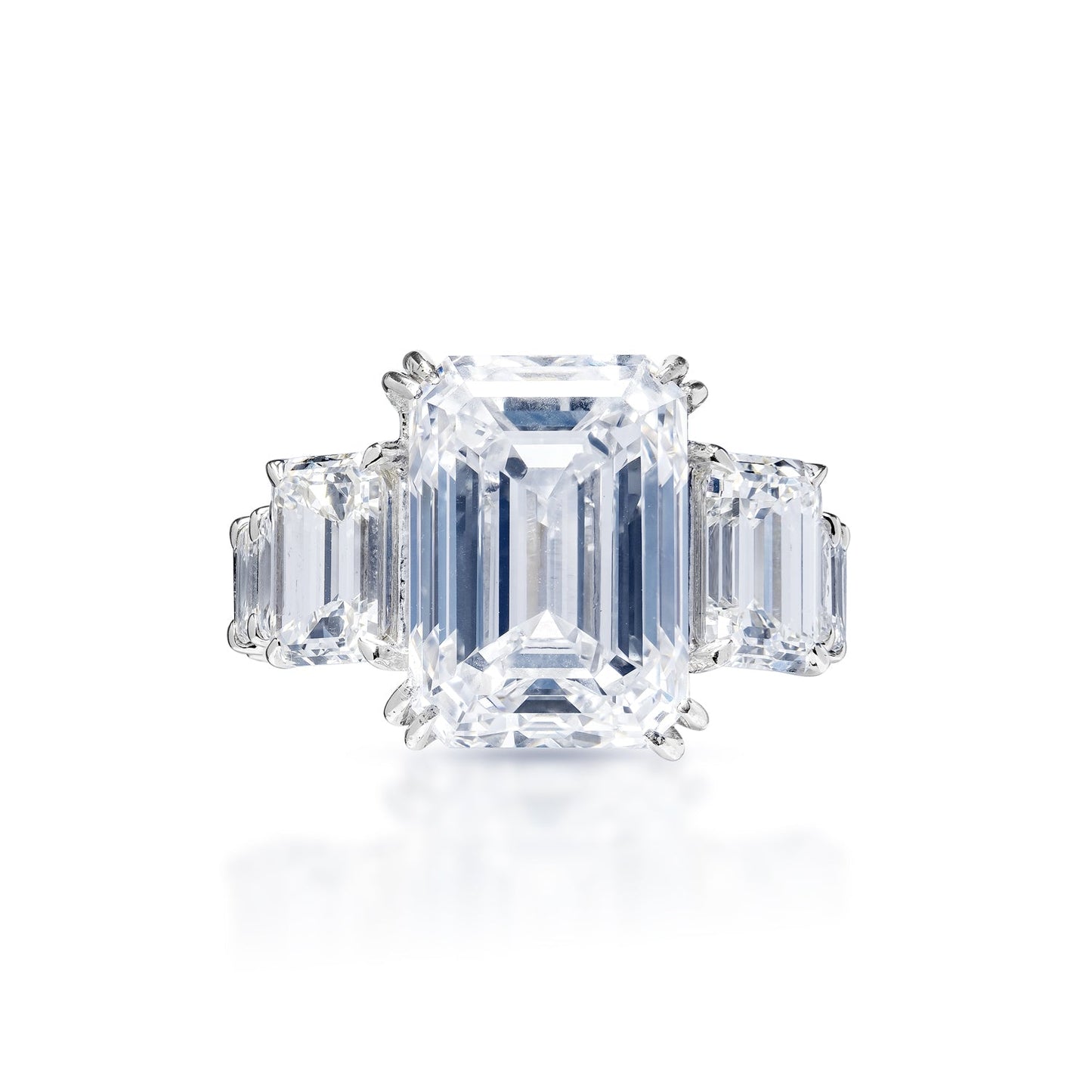 The ring itself is made of platinum, which is the most durable metal for an engagement ring. It is also hypoallergenic, so it will be comfortable for even those with sensitive skin. The metal weight is 11.20 grams, and the diamond style is emerald cut. The diamonds weight in at 6.94 carats in total.