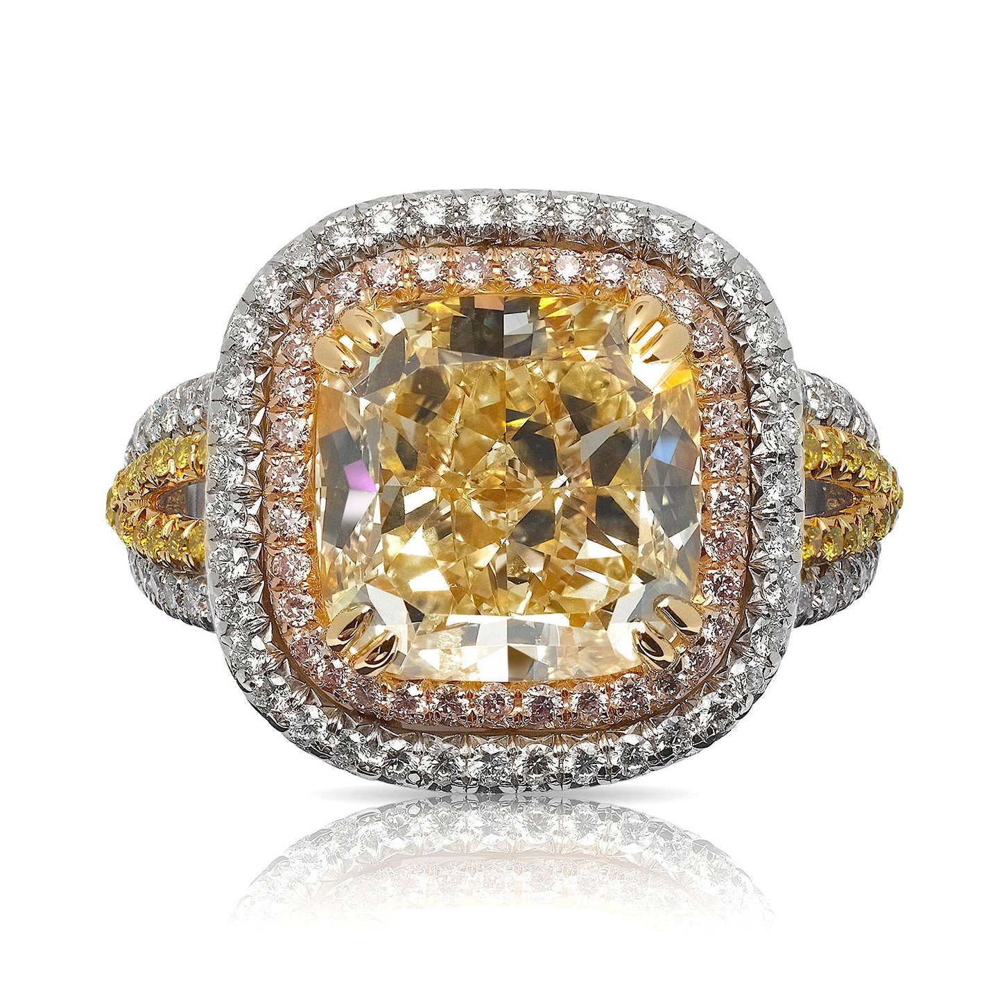 MIKAMI 8 CARAT CUSHION CUT NATURAL FANCY LIGHT YELLOW DIAMOND ENGAGEMENT RING PLATINUM PINK HALO CERTIFIED 6 CT FLY VS2 BY MIKE NEKTA