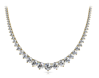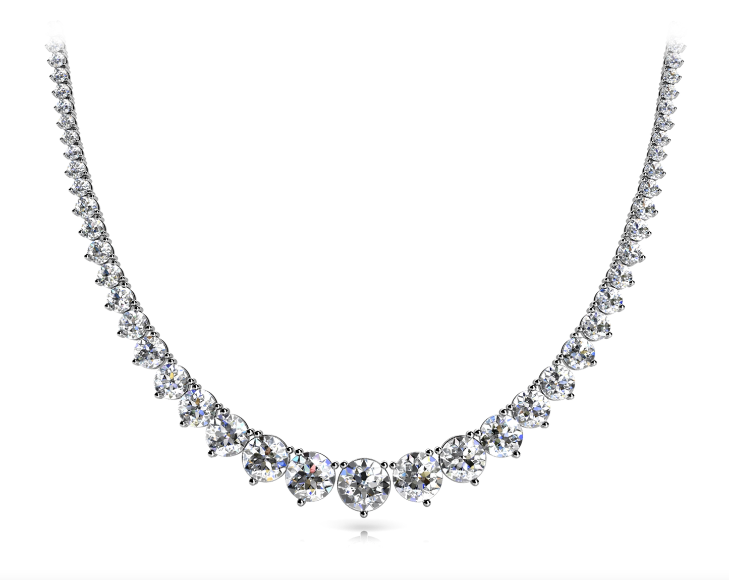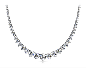 The MIST 25 Carat Diamond Riviera Graduated Necklace features 117 round brilliant natural diamonds weighing a total of approximately 25 carats, set upon 14K White Gold in a 3 prong setting.