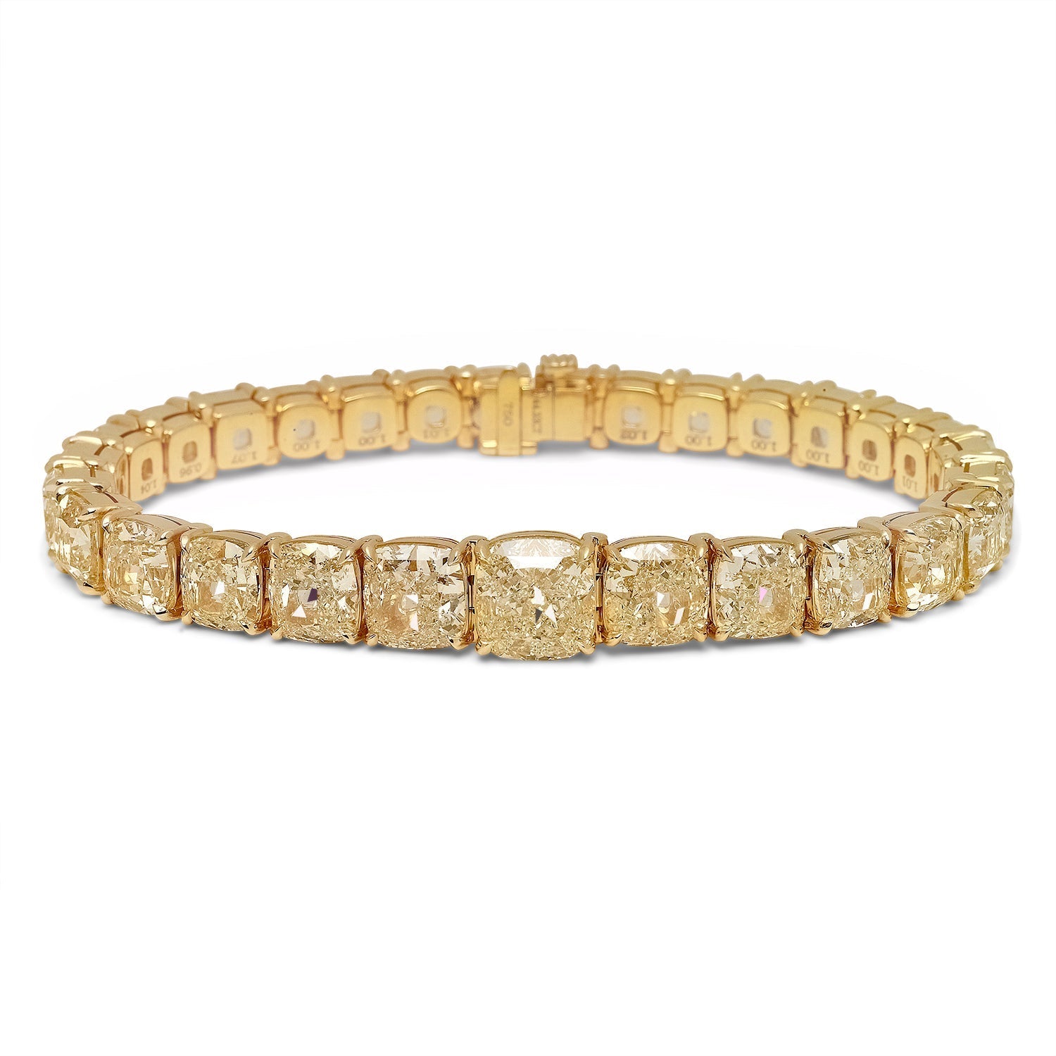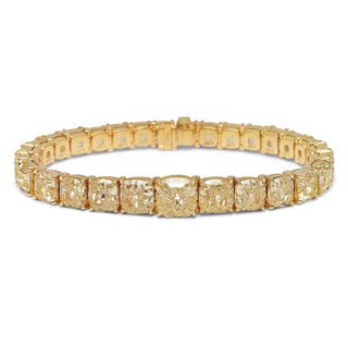 O2 44 Carat Fancy Yellow Cushion Cut Inline Diamond Tennis Bracelet in 14K Yellow Gold By Mike Nekta NYC