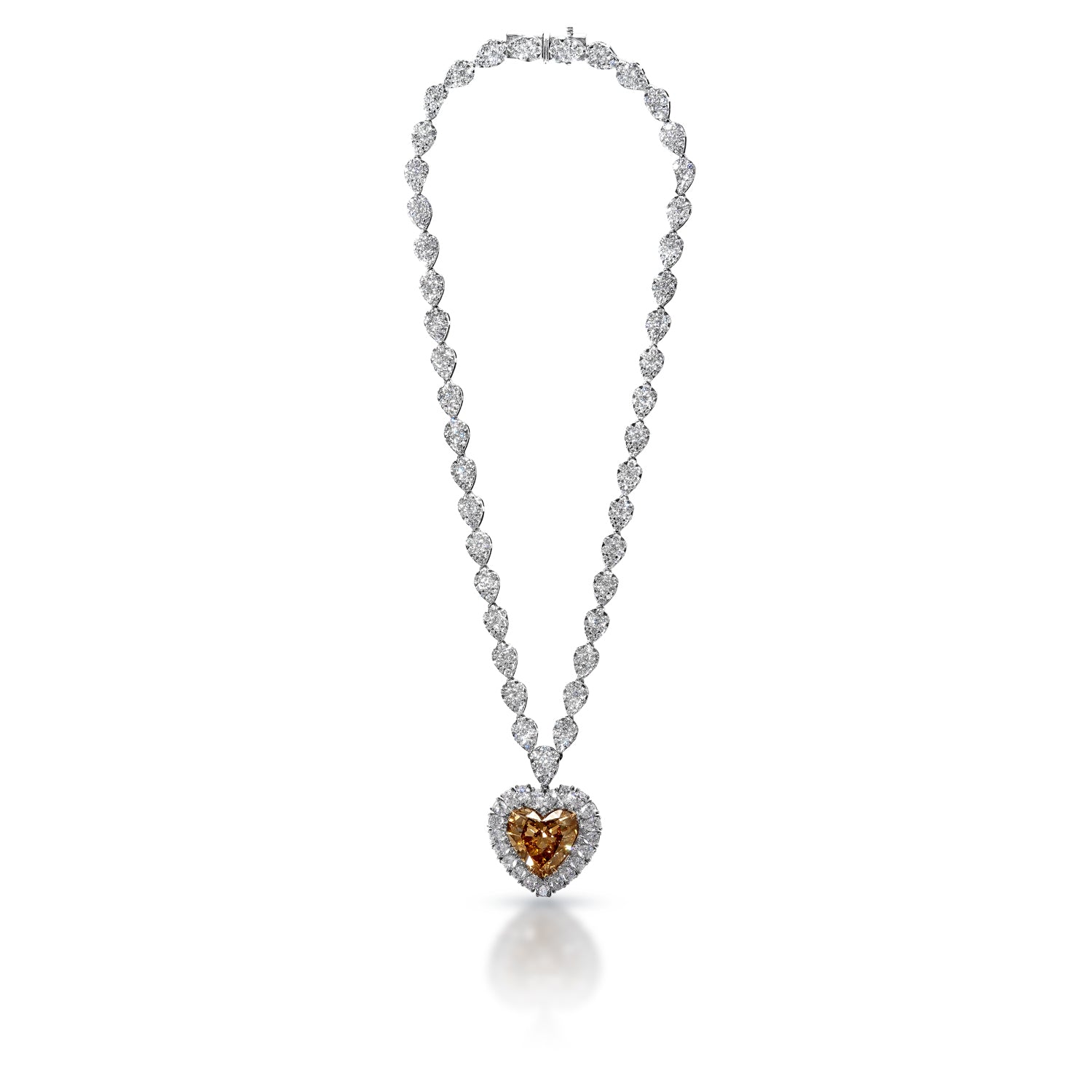 This stunning diamond necklace, inspired by the iconic one from James Cameron's Titanic movie, will have you feeling like the belle of the ball. The pendant is a heart shaped diamond swing and boasts 20 carats of a stunningly fancy brown hue. 29 carats of accent diamonds are set in a stunning round brilliant cut, pear shape and heart cut, making this a truly unique and special necklace, perfect for your special occasions. It comes complete with a 14 karat white gold chain weighing in at 48 grams, adding a perfect finishing touch to this statement piece. With earth mined diamonds, you know you're investing in a unique and valuable piece of jewellery.