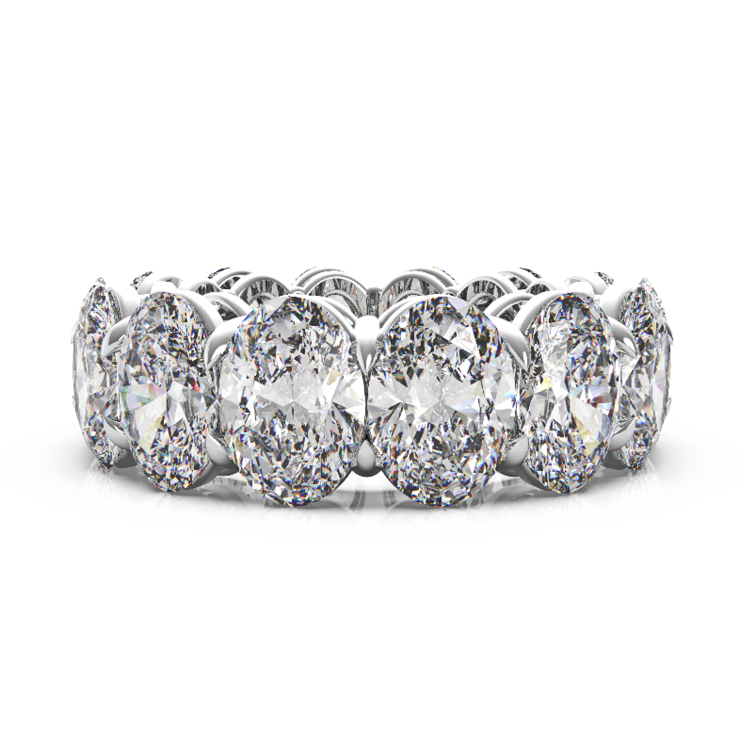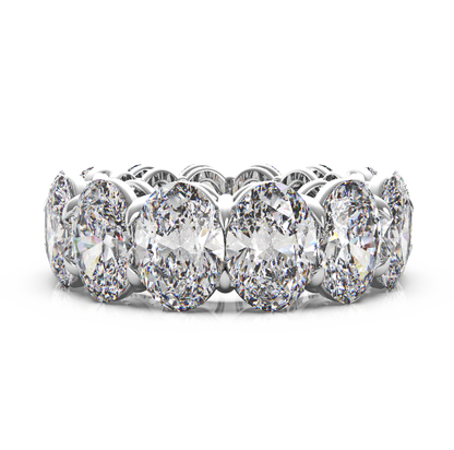 The SAINT Oval cut diamond eternity band features 14 GIA certified 1 carat natural diamonds weighing a total of approximately 14 carats, set in a shared prong Platinum setting.