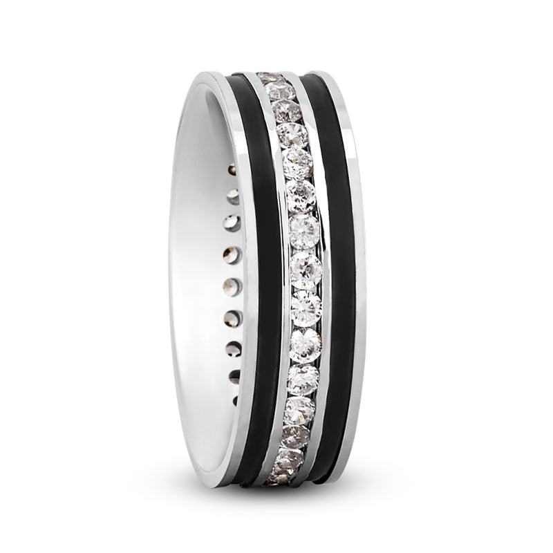 The TYR Diamond Eternity Wedding Band for Men features a Channel of 36 Round Cut brilliant 3 pointer diamonds weighing a total of approximately 1.08 carats between beveled edges, set in the metal of your choice. Rounded inner edges 8mm band, comfortable for everyday wear.
