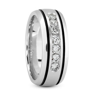 The TYR Diamond Wedding Band for Men features a Channel of 7 Round Cut brilliant 9 pointer diamonds weighing a total of approximately 0.56 carats between beveled edges, set in the metal of your choice. Rounded inner edges 8mm band, comfortable for everyday wear.
