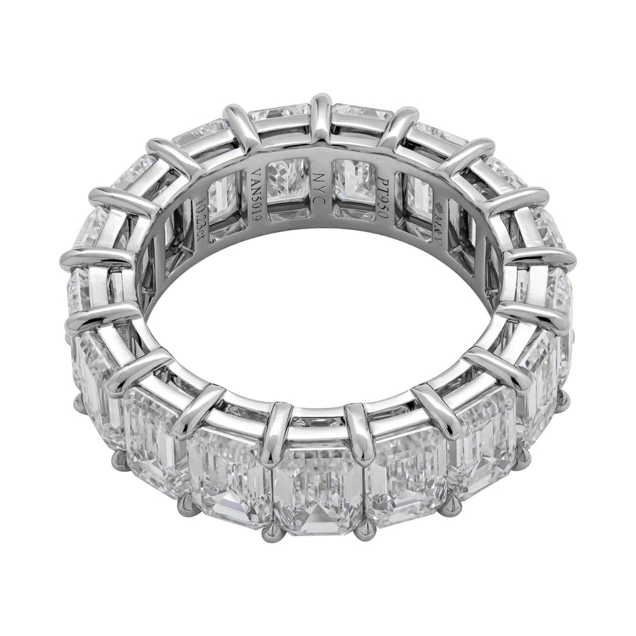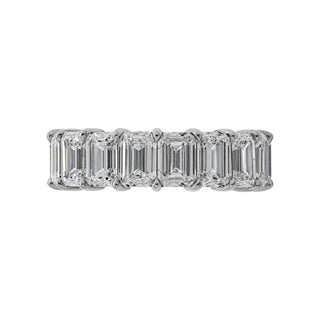 The ZOE Wedding Anniversary Diamond Eternity Band features 17 Emerald Cut 60 pointer diamonds weighing a total of approximately 10.23 carats, Shared Prong in Platinum.